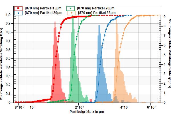 - Es stehen monomodale Suspensionen mit den nominellen Partikeldurchmessern: 15µm, 20µm, 29µm und 38µm zur Verfügung.